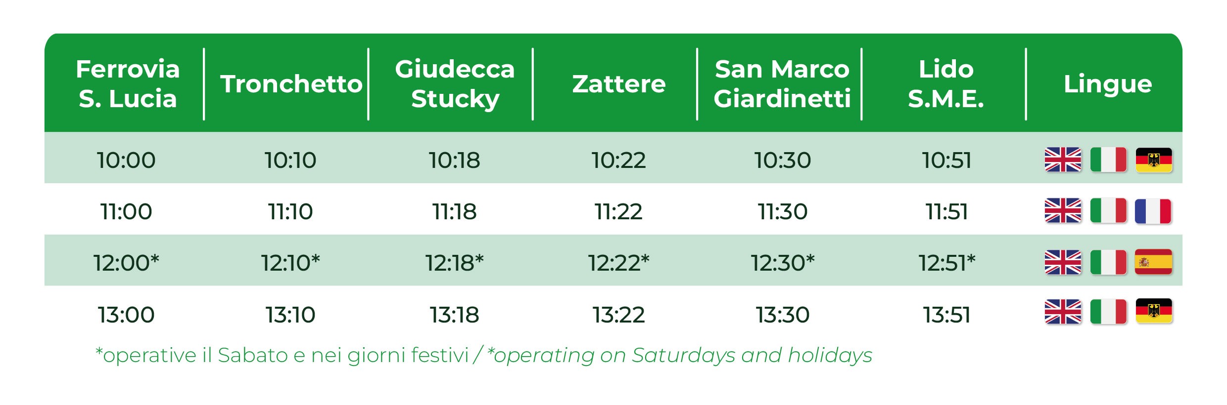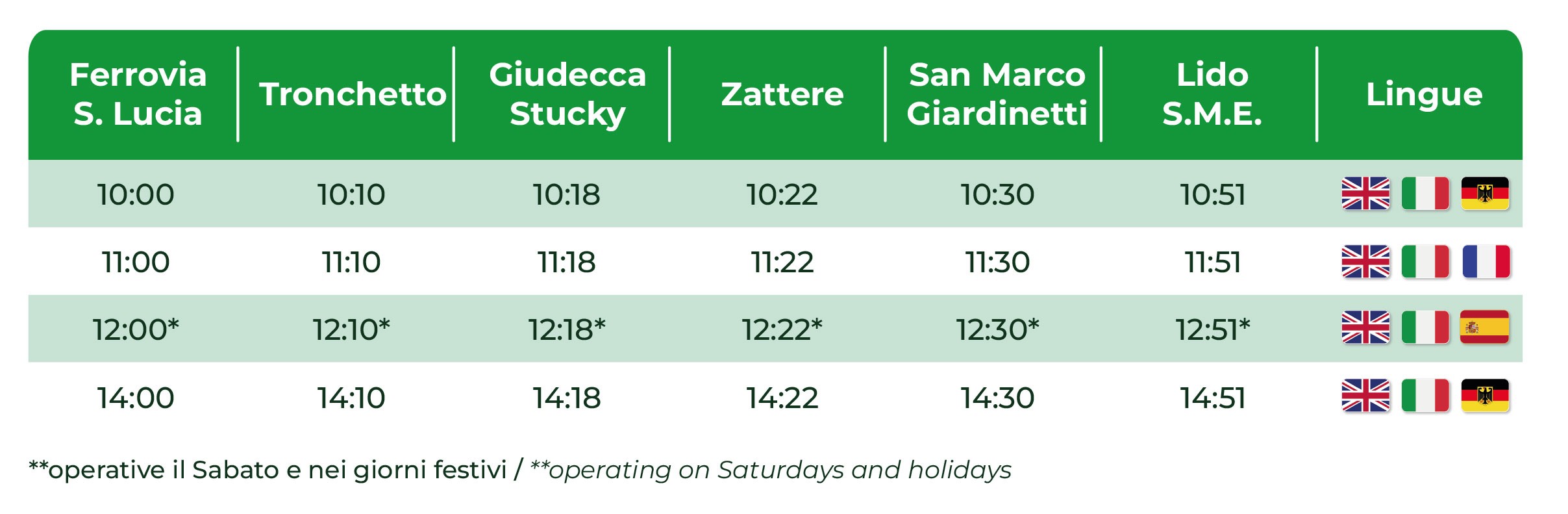 Embarques: Estación de tren (S. Lucia), Zattere, San Marco (Giardinetti).
